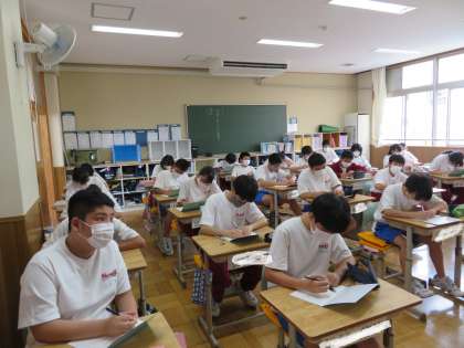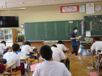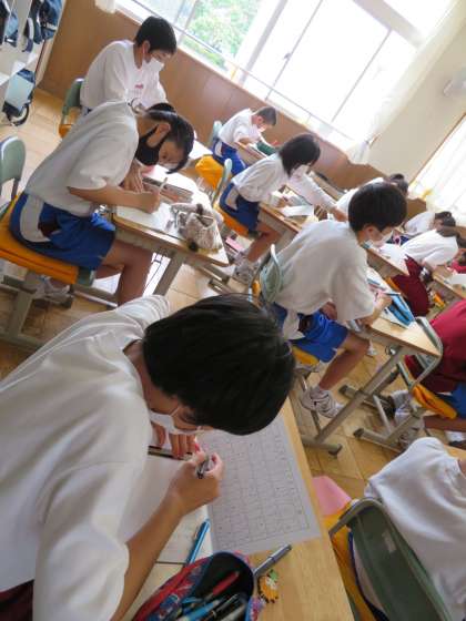 短歌の学習です。「心と自然」「音楽と歌」などテーマを決めて思考しています。57577のリズムで感じたことや想像したことを書いてみてください。題材をどう捉えて、どのような言葉を使って描写するかなど、書き手のものの見方や感性が表れます。言葉や表現の工夫が必要ですね。完成を楽しみにしています。