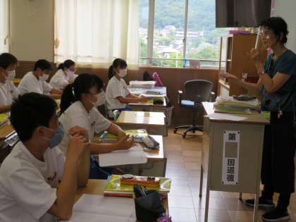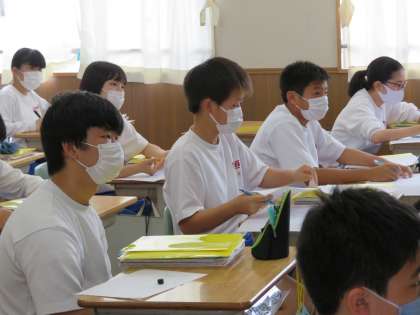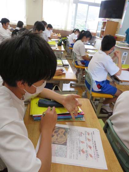 休校中の課題も活用してハンドサインのデッサンをしていきます。例えば、頑張ろうと手をグーに握ったときには、血管や筋肉の隆起なども描けると良いと説明がありました。自分が感じ取ったことや考えたことなどを基に、絵を描いていきます。感性が大切ですね。