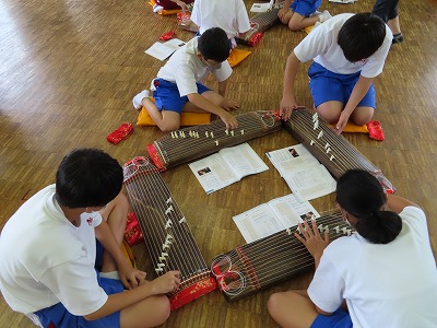 1B音楽:「さくらさくら」を箏で弾いています。なじみの深い曲なので、口ずさみながら弾いて、音程やリズムを確認していました。