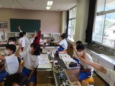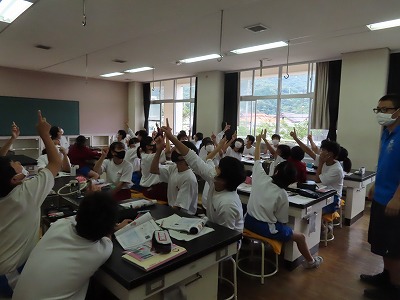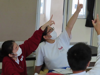 2B理科:利き目を調べています。1点を両目で見た後、それぞれ片目で見ています。ずれる方の眼があることを知って。驚いていました。また、その利き目をどう活かすか、授業の中で考えています。
