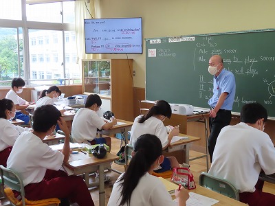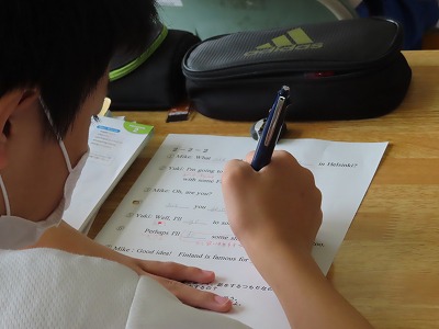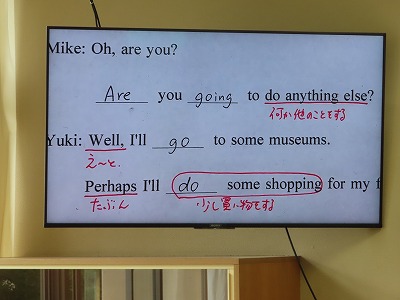 2C英語:リスニング問題の解答を行っています。大型テレビに解説の内容が映っているため、言葉だけの説明よりもとてもわかりやすいです。