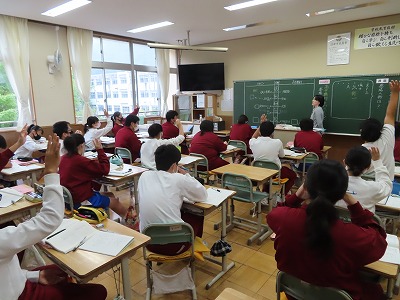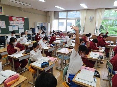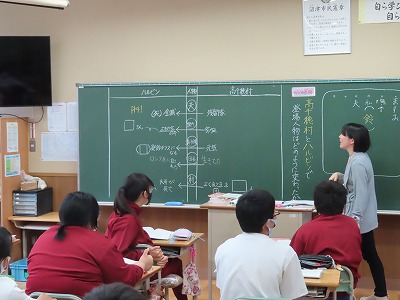 2A国語:「高千穂とハルビンで登場人物の心情はどのように変わっていったのか」文章から読み取っています。朗読した後、「おかしな文」に着目しながら、考えていきました。表を巧みに使って、視覚的に理解しやすくなっています。