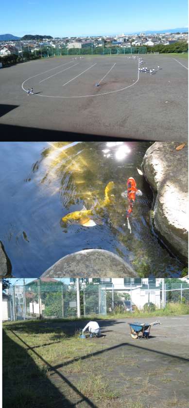 ○用務員さんが、早朝より外のバレーコートの草取りをしてくれています。ありがとうございます。池の鯉もいつもより元気です。