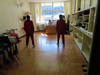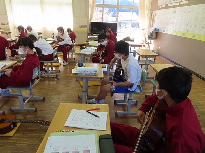 2C音楽:「翼をください」の歌のテストを行っています。女子は、ソプラノとアルトにわかれて、2人1組で行っています。きれいな声が響いていました。待っている生徒は、ギターの練習などを行っていました。