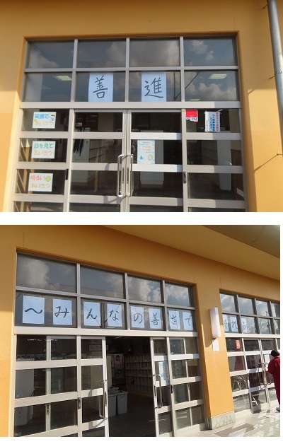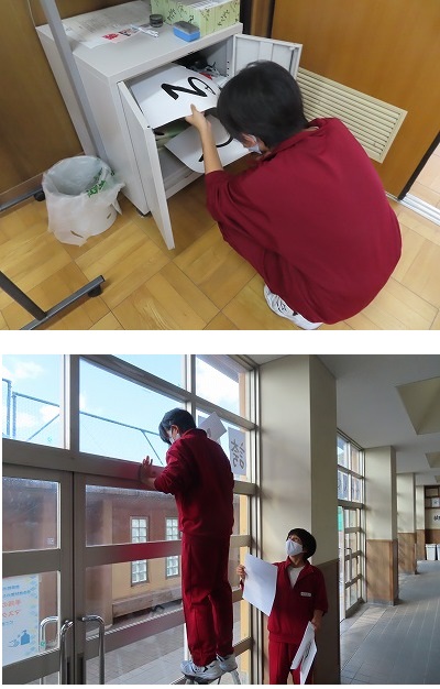 昼休みに後期生徒会スローガンを掲示しました。「善進〜みんなの善さで誇れる三中〜」です。前からもしっかりみて、曲がらないように確認しながら、丁寧に掲示していました。