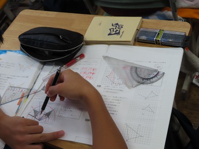 1C数学:図形を回転移動させるとどうなるか、また90度回転させたときにはどんな一になるのか、考えています。
