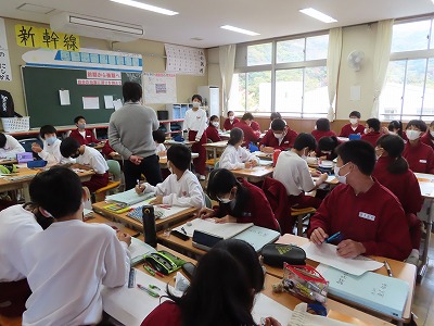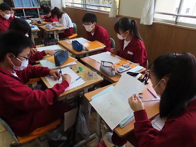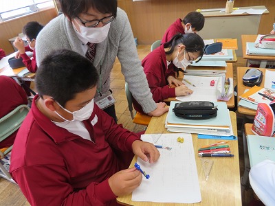 1A数学:同じ角度を、コンパスを用いて作図しています。できた生徒は、先生にどのようにして作図をしたのか説明し、できた時には、満足げなようすでした。