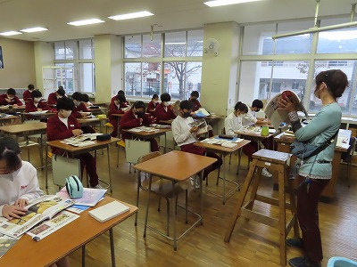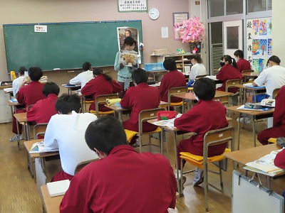 2A美術:「琳派」の魅力について、写真を見ながら考えています。また、「サモトラケのニケ」が何のモデルになったのかわかりますか。「ニケ」をローマ字で書いてみてください。
