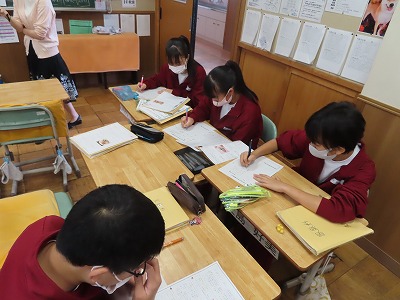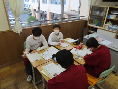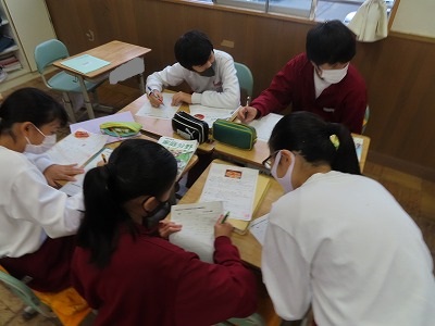 2D家庭科:同じ班以外の生徒の調べたことを情報交換しています。時間を決めて、6人の生徒とやりとりを行っています。