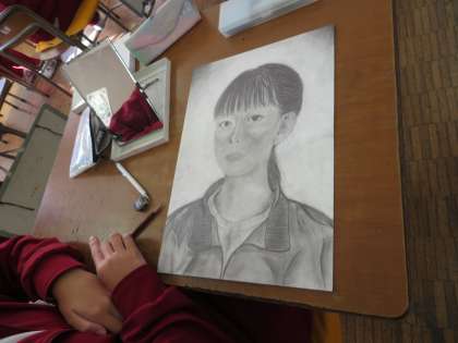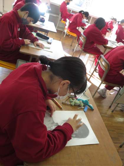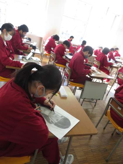 自画像を描いています。鏡に映された自分と向き合い、自分の特徴を掴み、集中して描いています。みんな上手に描いています。