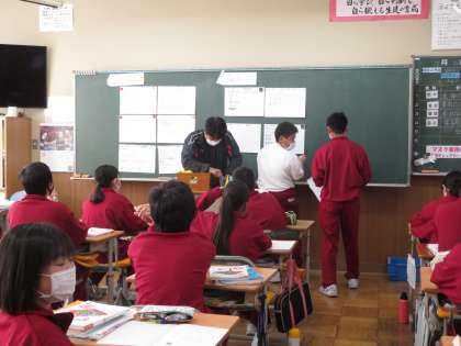 立体図形について学習しています。まずは三角すい、四角すいの形をした身近な図形をグループで考えました。ピラミッド、カラーコーン、メトロノーム等など、空間図形は実際の図形のイメージが大切です。