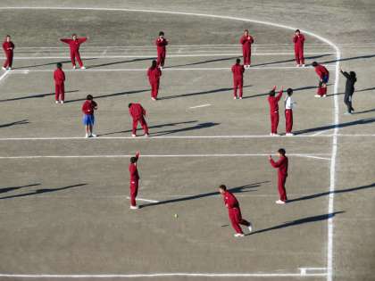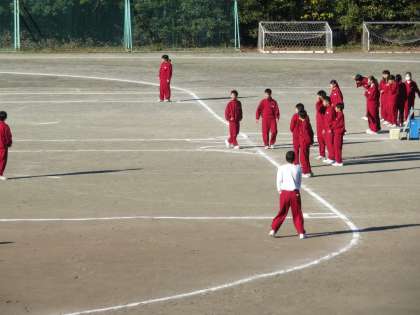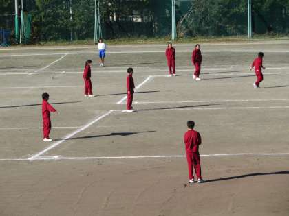 ソフトボールの授業です。ウォーミングアップをして、柔らかいボールでキャッチボール、ゴロキャッチボールなど基本的な練習からスタートです。