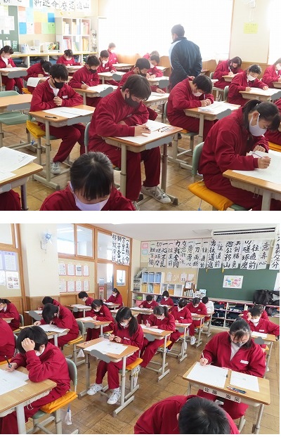 1年生は学力調査を受けるのは初めてです。今まで学習した内容の確認をする、実力テストです。一生懸命問題を解いていました。