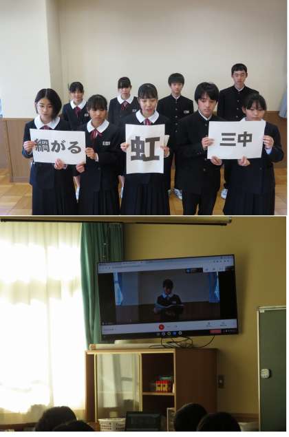 多目的室からのリモートによる生徒集会です。コロナ感染拡大前にはない光景ですが、昨年度途中から当たり前の光景になってきました。コロナ禍ではありますが、教職員と生徒共に知恵を絞って教育活動を実施していきます。前期の生徒会役員がスローガン「綱がる三中 虹」とスローガンに掛ける思いを語ってくれました。ありがとうございます。