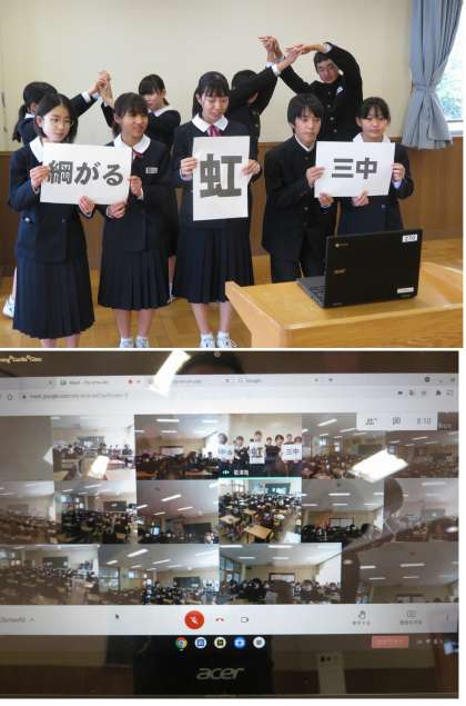 多目的室からのリモートによる生徒集会です。コロナ感染拡大前にはない光景ですが、昨年度途中から当たり前の光景になってきました。コロナ禍ではありますが、教職員と生徒共に知恵を絞って教育活動を実施していきます。前期の生徒会役員がスローガン「綱がる三中 虹」とスローガンに掛ける思いを語ってくれました。ありがとうございます。