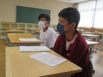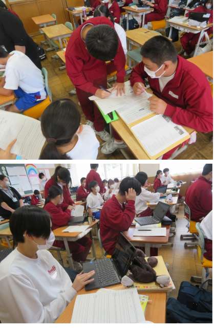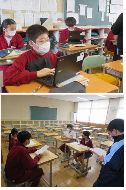 「防災バックの中身について仲間と英語で話し合う」テストです。事前に自分が考える防災グッズを理由も含め英文で書きました。それを仲間へ説明していきます。Chromebookを活用し写真で示すことも可能です。