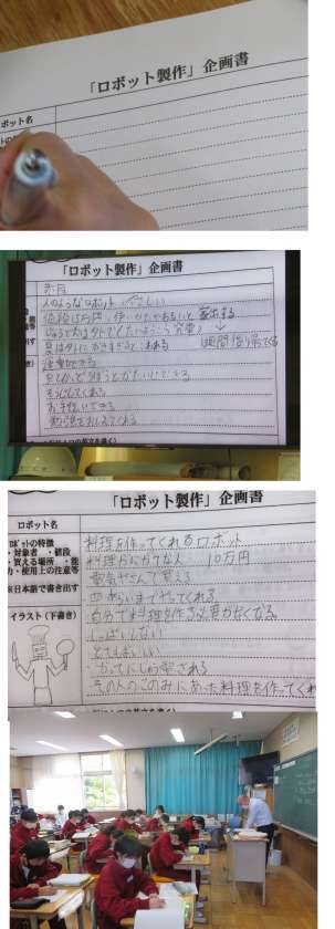 世の中であると便利だなと思うロボットを考えていきます。他のクラスで考えた例を提示しています。実際にこの中のロボットが試作品にでもなればすごいことですね。もちろん英文で紹介できるようにしていきます。