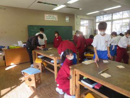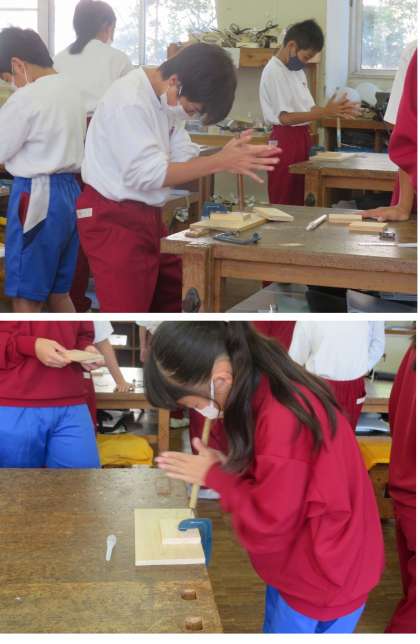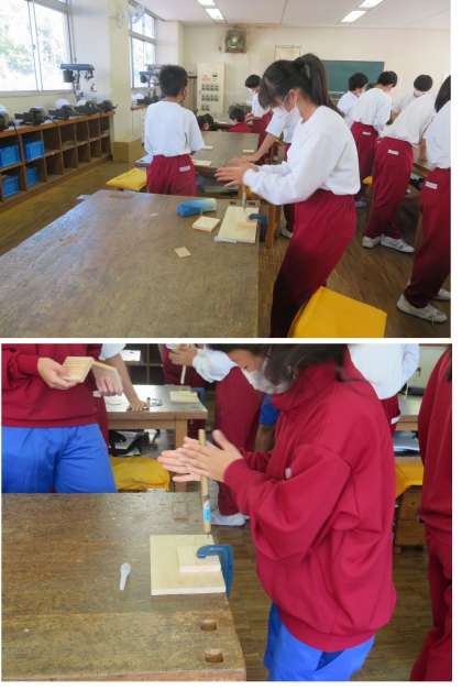 木工の授業です。今日はキリを使用して二枚重ねの木材に穴を開けています。生徒は腕が筋肉痛だと話していました。それだけ一生懸命取り組んだ証拠ですね。