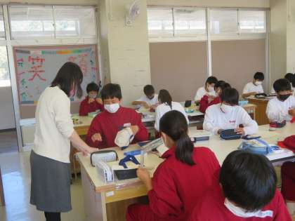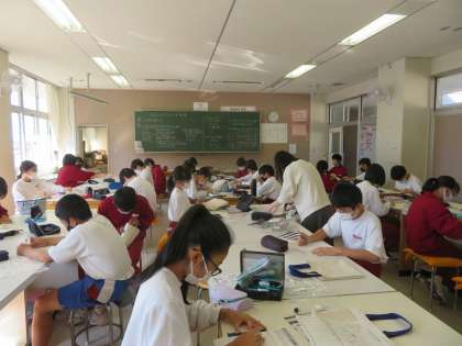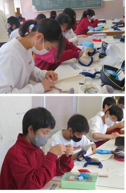 オリジナルマイバッグの制作です。針に糸を通したり、ポケットを縫ったり集中して頑張っています。完成した作品が楽しみです。
