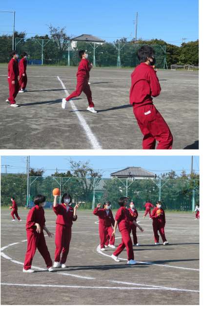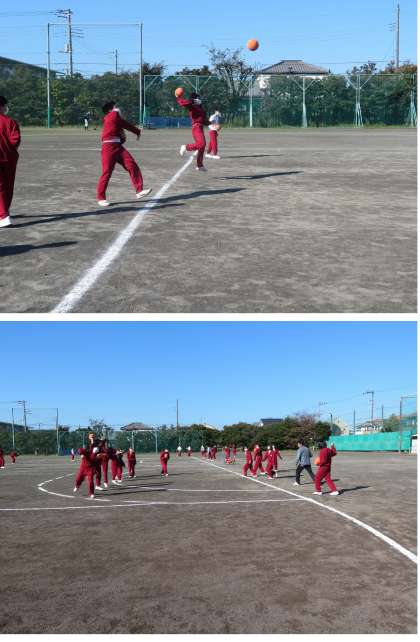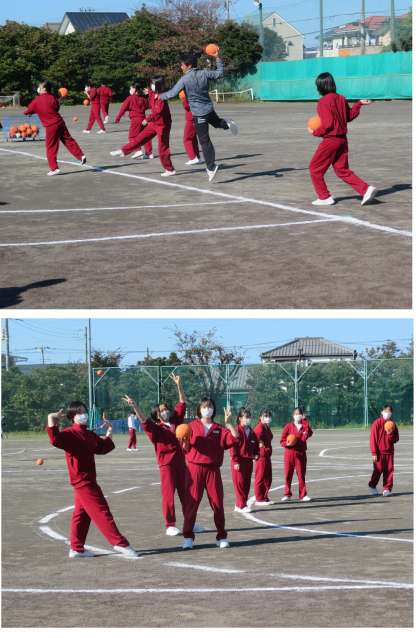 ハンドボールの授業です。先生が、シュートの模範演技をしています。さすが3年生です、覚えが早くシュート体勢上手ですね。