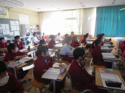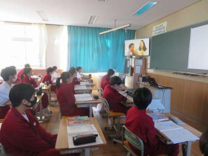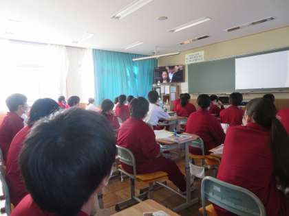 裁判員制度の仕組みについて、裁判の動画を視聴して学習しています。模擬裁判のシーンですが、どのような判決になるか経過にも興味が高いです。みんな真剣です。
