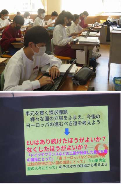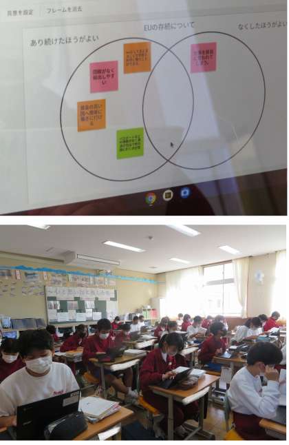 「EUはあり続けた方がいいのか。なくした方がいいのか。」Chromebookを活用してベン図(思考ツール)に書き込んでいます。後ほどみんなの意見や感想も共有していきます。今まで学習してきたことや、資料等を参考に、自分の意見をアウトプットしています。大切です。
