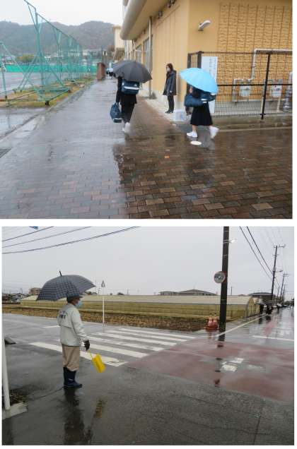 ○冷たい雨が降る中ですが、保護者の皆様、民生委員の皆様、職員であいさつ運動、登校見守り、健康観察カード回収です。ありがとうございます。