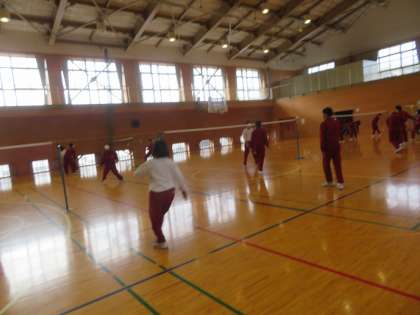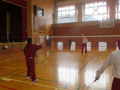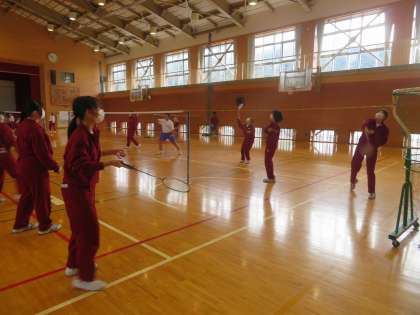 バトミントンの授業です。ペアでゲームを楽しんでいます。なかなかみんな上手です。ネットが不足している場所は、手作りネットで工夫しています。