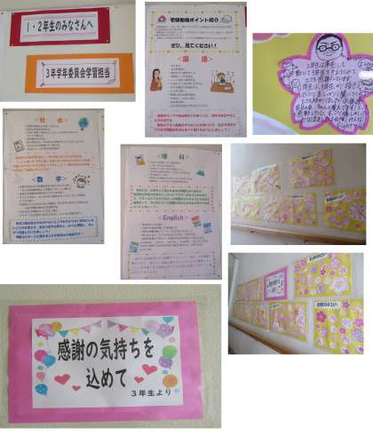 ○3年学年委員会の取組で、1、2年生へメッセージです。5教科の学習ポイントや部活動メッセージを掲示してくれました。後輩思いの3年生の皆さん、温かい応援メッセージありがとうございます。