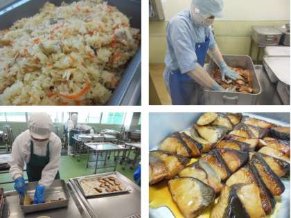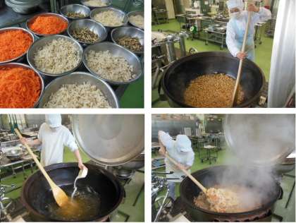 今日は一足早いですが、ひなまつり献立で、ちらし寿司を作りました。ちらし寿司は普段の炊き込みご飯とは違い、ごはんが炊きあがったところに合せ酢を混ぜます。ごはんと合せ酢が同じ温度になるように、合せ酢を作るタイミングも調整しています。また明日からの受験応援の意味を込めて、ちらし寿司には運盛りとして『にんじん・れんこん』、そして出世魚の『ぶり』を使った照り焼きを作りました。