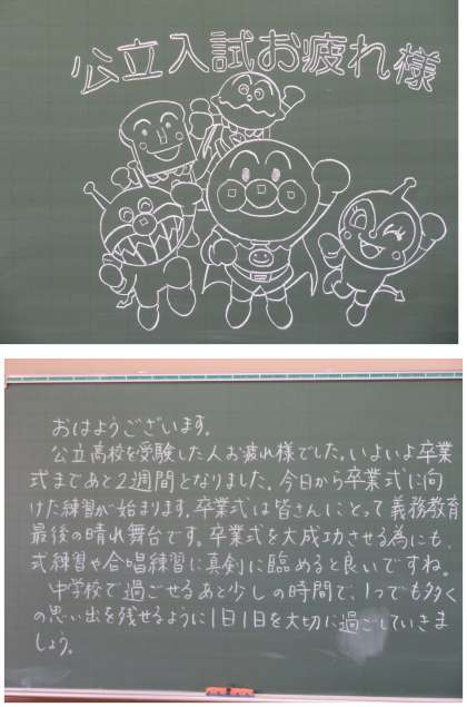 3年生の皆さん、県公立の受験お疲れ様でした。卒業までの日々を大切に過ごしていきしまょう。