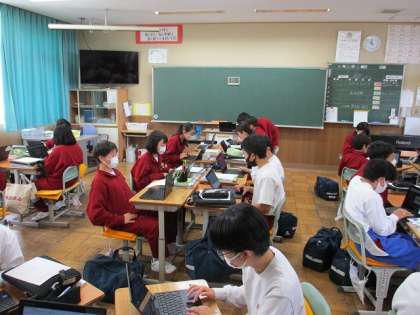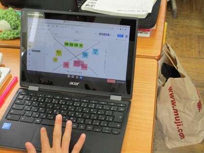 地理の学習です。“日本はどのような国?”Chromebookで意見共有しています。