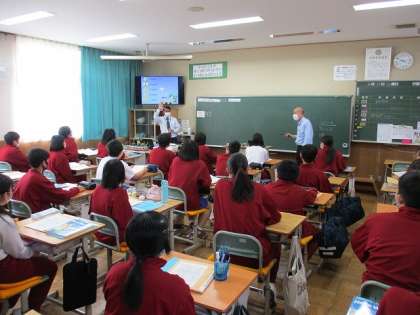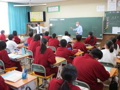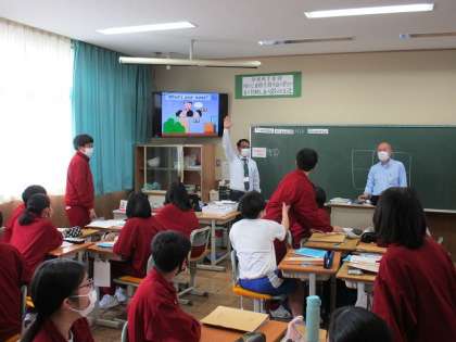 画面に出ている問題番号を選ぶと、ALTのベビス先生が英語で質問します。班の代表者が答え、ポイントを競っています。