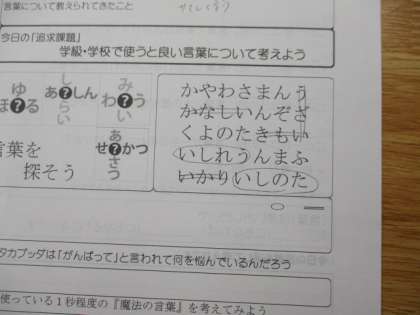 1秒の言葉 プラスの言葉を○で囲み、マイナスの言葉は消しています。