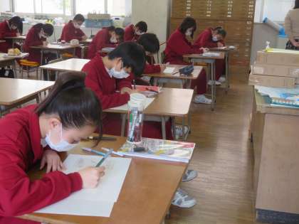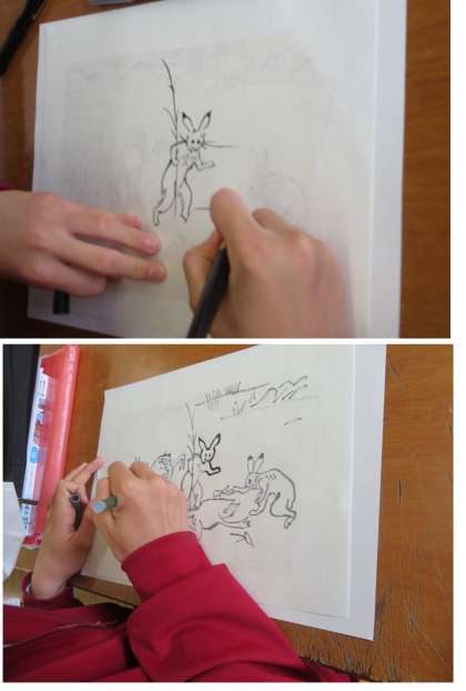 「鳥獣戯画」模写をしています。みんな真剣に集中して取り組んでいるので、一人ひとりの作品も大変上手です。