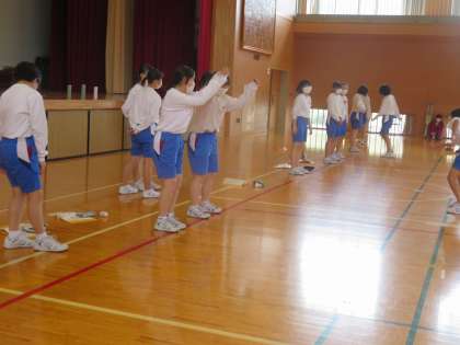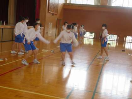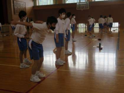 「力強い運動を高める動き」立ち幅跳びを練習しています。目標を決めて取り組んでいました。