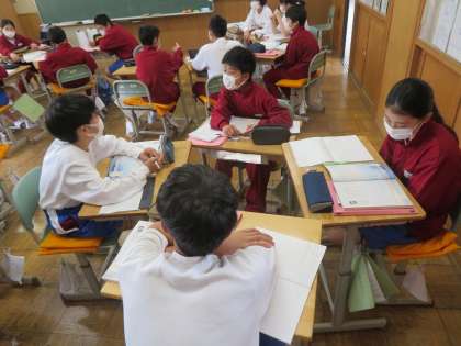 「朝のリレー」谷川氏 作者の伝えたいことは、何だろう。グループで意見を交換しています。