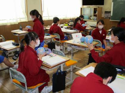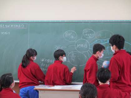 地球を眺めよう! 地球について気づいたことを話し合っています。
