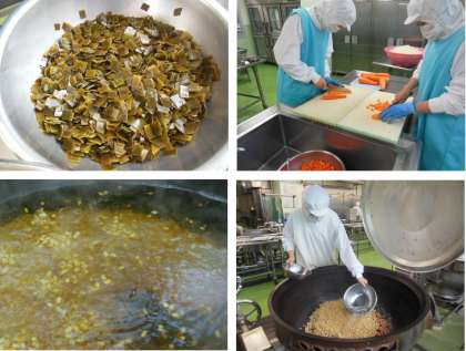 何を作っている様子でしょうか?材料を角切りにすることが特徴です。大豆は乾燥大豆を煮て、ふっくら仕上げました。砂糖や醤油、だし汁などで煮ていきます。