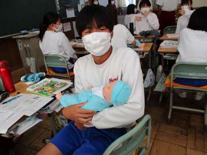 幼児の成長 乳児の抱き方を学んでいます。