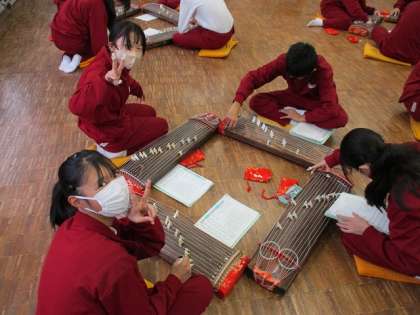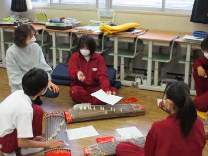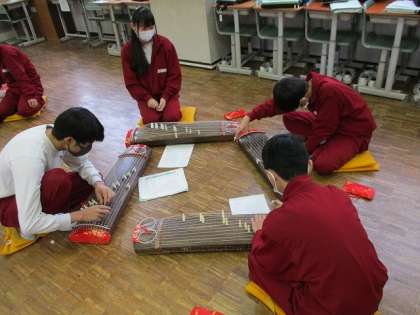箏曲「さくら さくら」旋律や奏法を確認しながら練習しています。音楽室に春がやってきました。