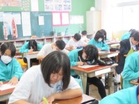 1年A組の英語の時間です。小テストを行っています。真剣に向かい合っています。