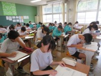 1年B組の家庭科の時間です。災害の備えについての学習をしています。買い物に出かけているとき、大きな災害が発生したらどう行動するべきか確認しています。