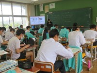 2年B組の社会の時間です。地理的分野「中国・四国地方」の学習です。産業の発達や交通の結びつきなどを学習しています。
