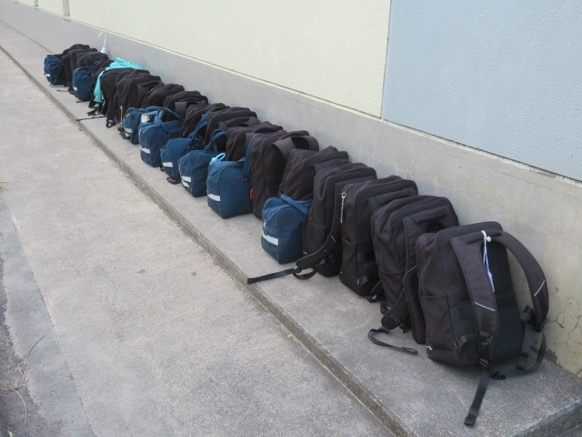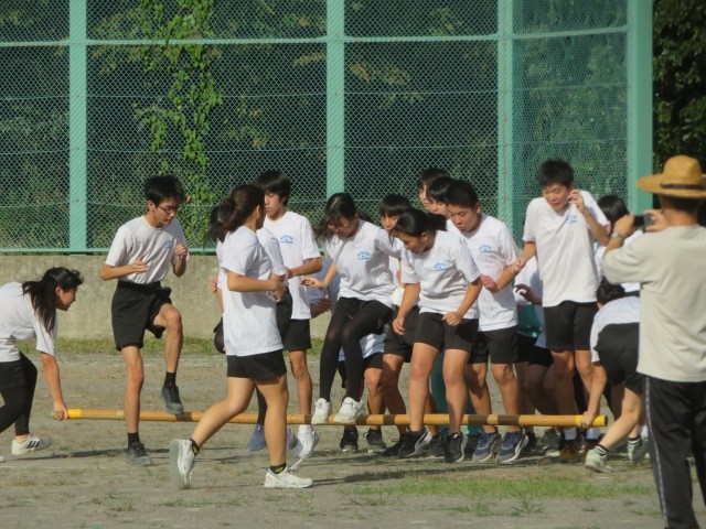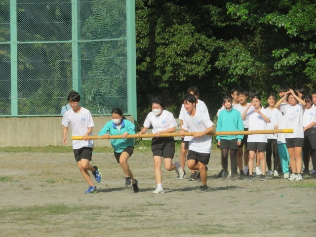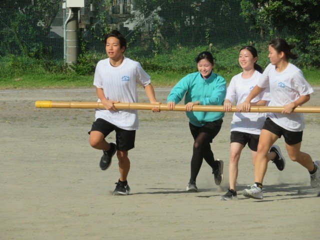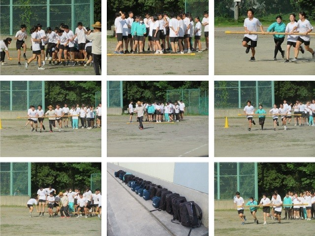 清流祭に向けた学級練習の様子です。グラウンドでは、「台風の目」の練習に取り組んでいました。体育館脇に整然と並べられたカバンが目につきました。チームワークで記録更新に挑戦です。