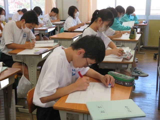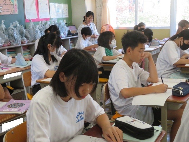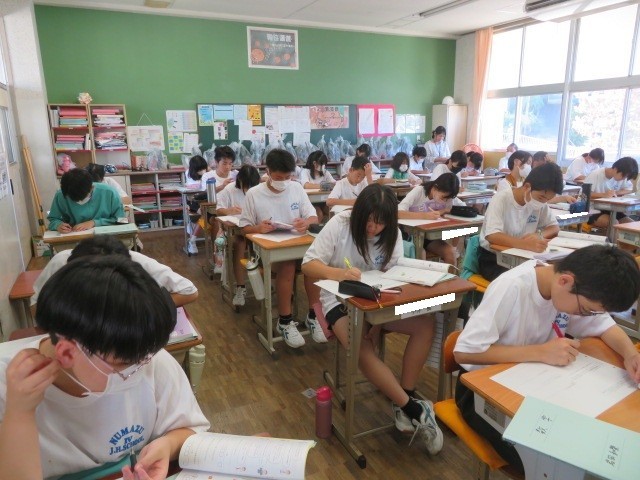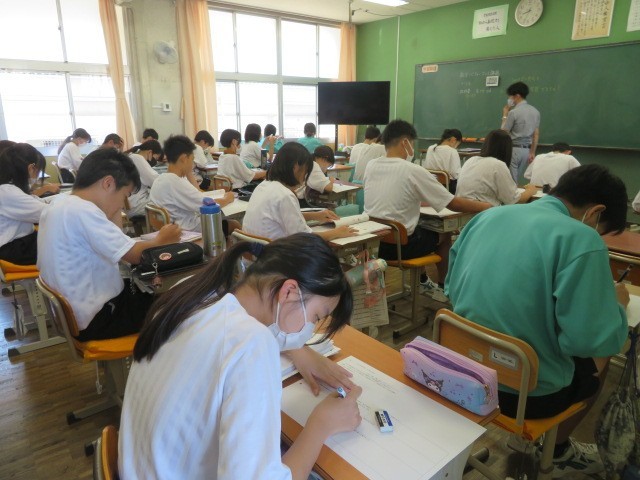 1年A組の数学の時間です。数学パフォーマンステスト、文字式の応用に取り組んでいます。今までの学習をいかして頑張っています。