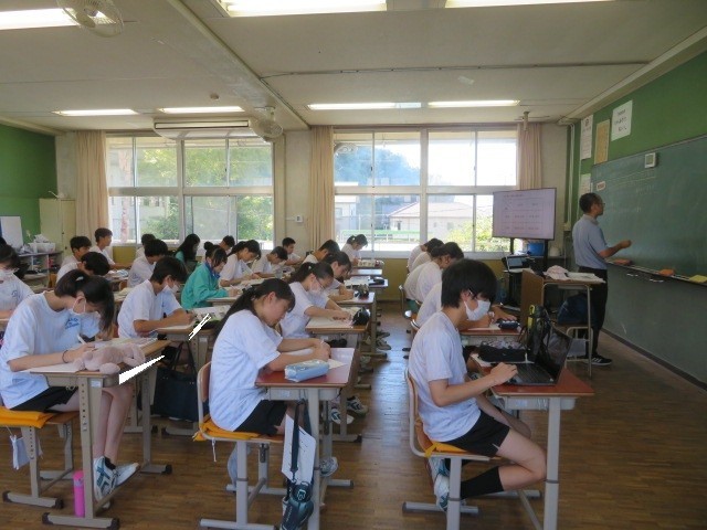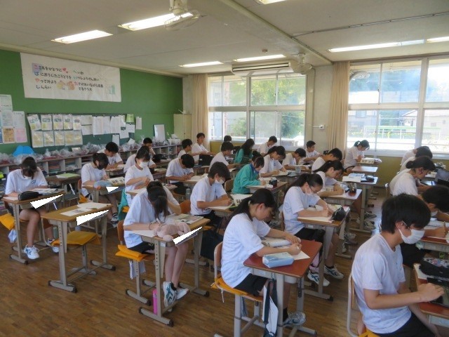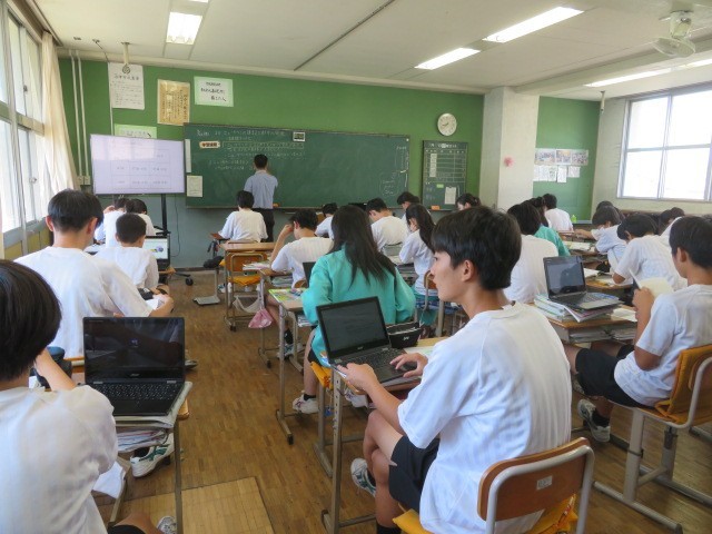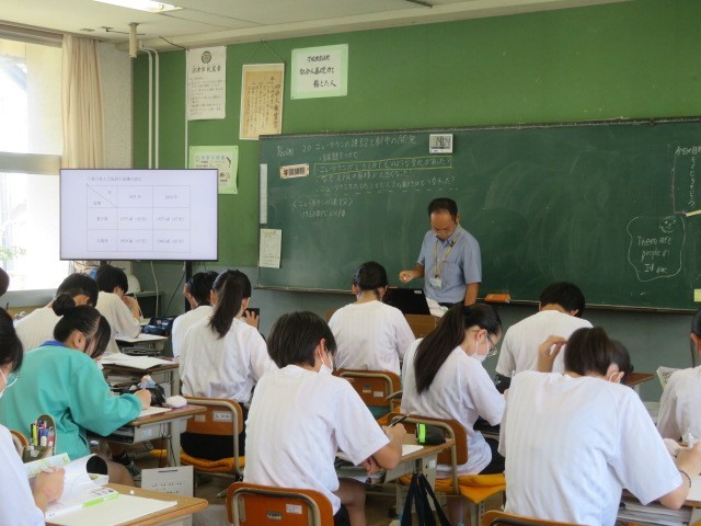 2年B組の社会の時間です。近畿地方「ニュータウンの建設と都市の開発」の学習をしています。ニュータウンが開発された背景、年月が経過した現在の課題に迫ります。