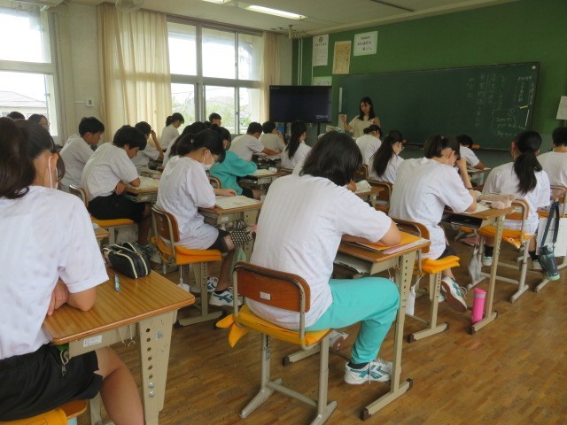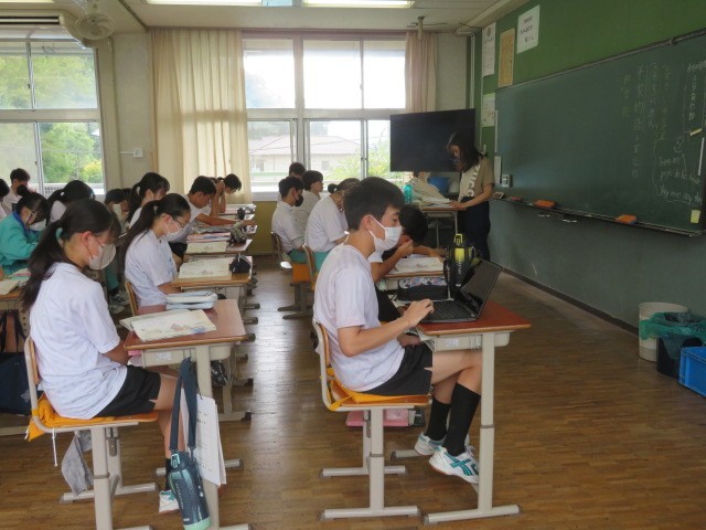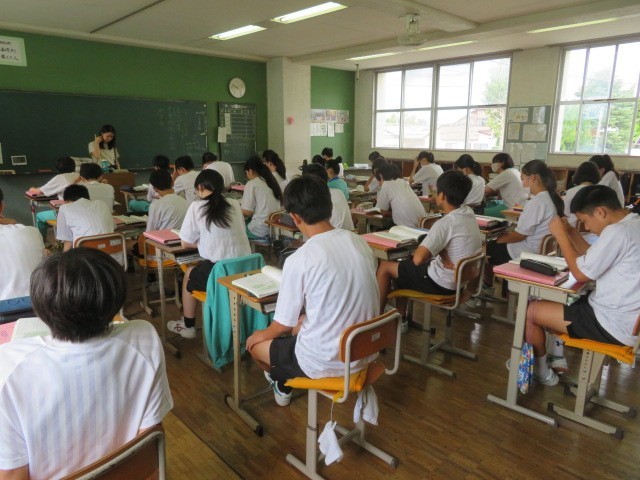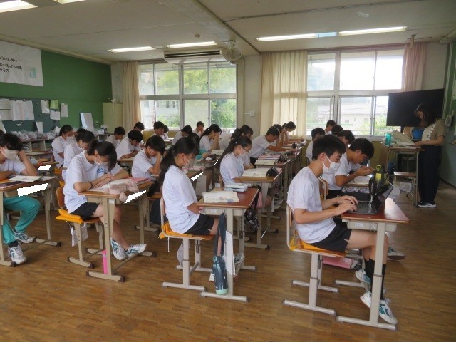 2年B組の国語の時間です。平家物語の学習に取り組んでいきます。平家物語が作られる源平の争いの様子について先生の話に耳を傾けています。