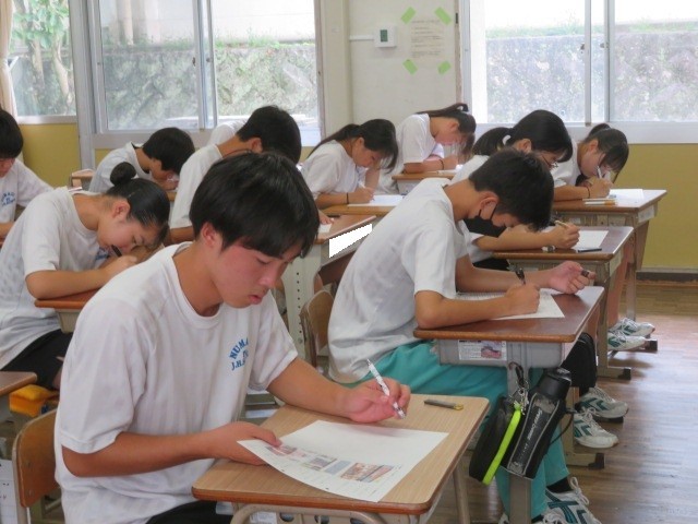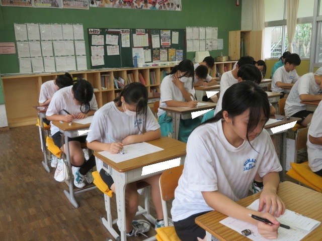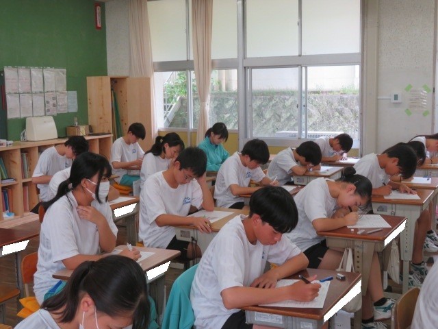 3年A組の英語の時間です。今日は単元テスト。学習の成果を発揮できるよう集中して取り組んでいます。