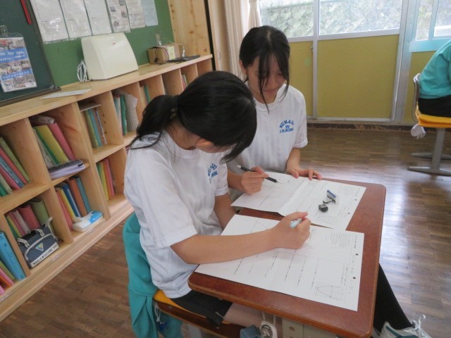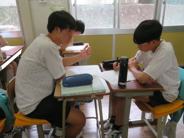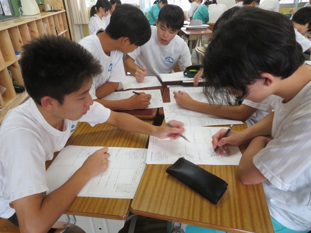3年A組の数学の時間です。二次関数の応用問題に挑戦しています。一人、自力で挑戦する人、仲間と相談しながら解いていく人、それぞれに頑張っています。